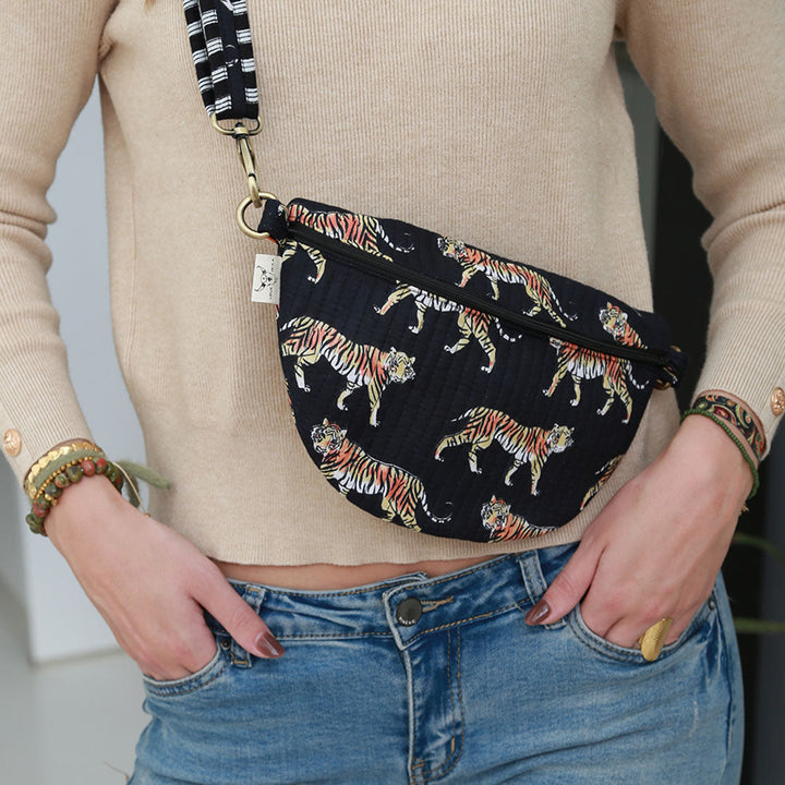Cute crossbody bag in a great handmade block print. The bag has a matching zipper closure and an adjustable handle.