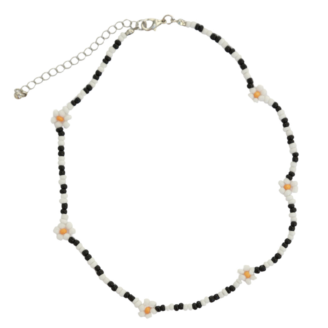 Oopsy daisy ❀ Super cute choker kettinkje van zwarte en witte kraaltjes met madeliefjes.