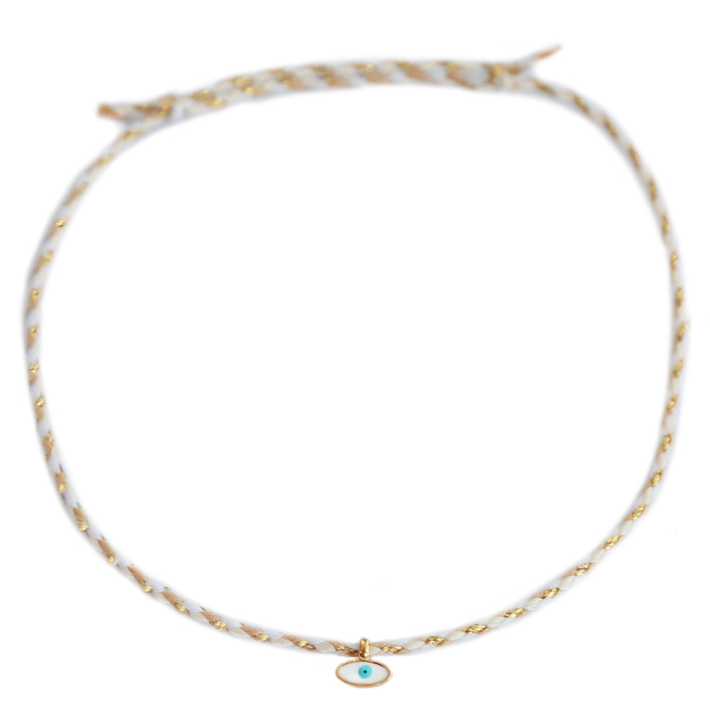 Fijn enkelbandje van wit met goud draad met een kleine gouden evil bedel.