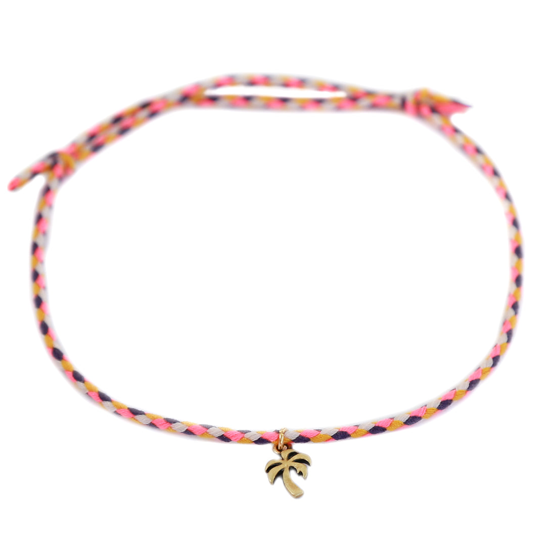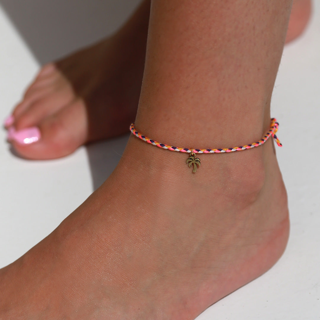 Fijn enkelbandje van gekleurd draad met een kleine koperen palm bedel.